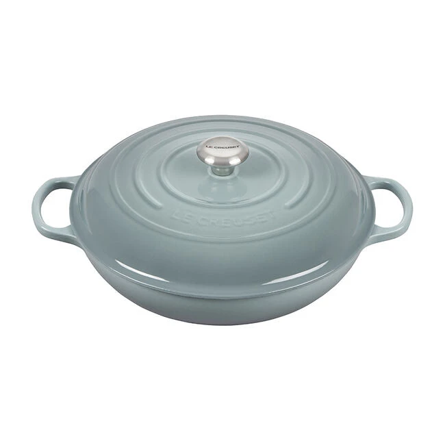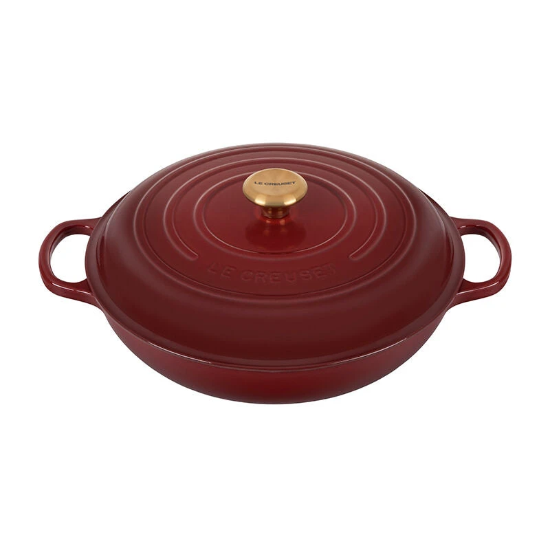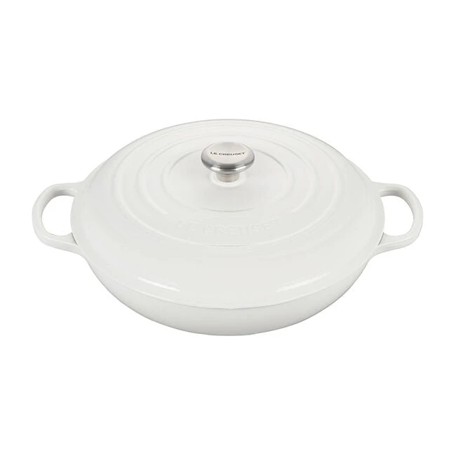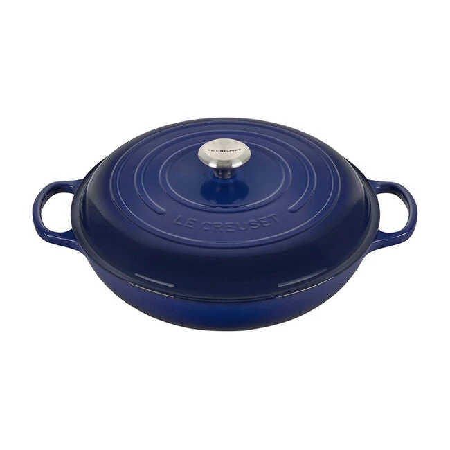 The Le Creuset enameled cast iron Braiser is uniquely designed to provide steady, even heat to transform tough cuts of meat and hearty vegetables into tender, flavorful dishes. The wide base allows ingredients to be placed in a single layer for searing without crowding; once liquid is added, the domed lid circulates steam to lock in moisture and flavor. The versatile shape of the braiser also makes it perfect for shallow frying, steaming, stews, casseroles and serving at the table.