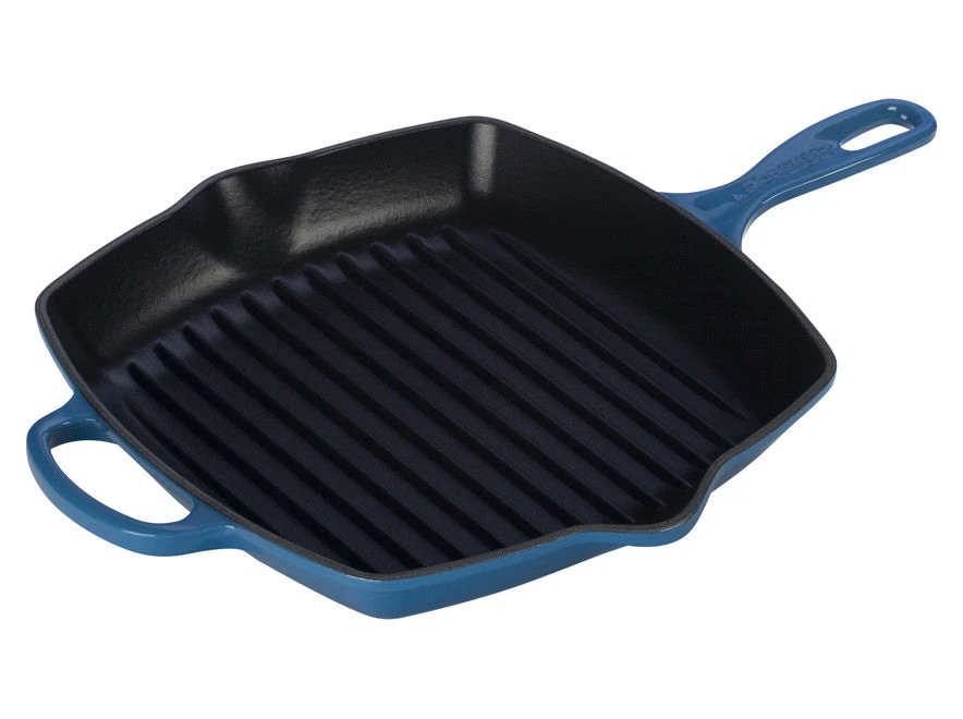 The Square Skillet Grill’s interior is coated with Le Creuset’s protective satin black finish to prevent damage and wear. Over time, this slightly abrasive interior develops a natural patina that is ideal for searing and frying.