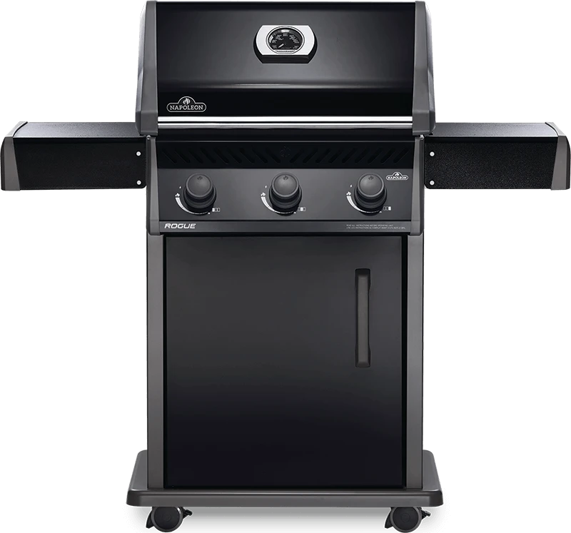 Napoleon’s Rogue® 425 Propane Gas Grill in black, is a premium quality gas grill with an affordable price. Three burners light every time with a battery-free ignition. This grill boasts precise temperature control, high heat searing over cast iron cooking grids and stainless steel sear plates for even heating and to keep your grill clean. The stylish black exterior is highly durable and easy to clean.