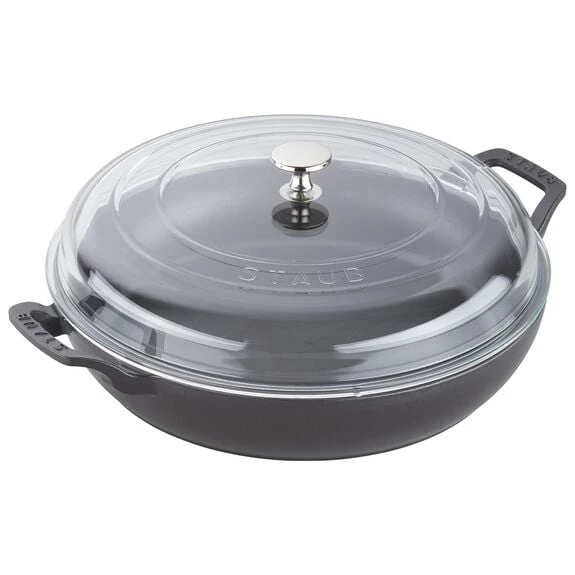 The STAUB 3.5-quart braiser with glass lid is the perfect cookware for one-pot dinners, slow-cooked braises, and simmered soups. The heavyweight, domed glass lid locks in moisture and accommodates large cuts of meat. STAUB cast iron possesses exceptional heat-retention qualities, so the pot heats evenly throughout. The textured black matte enamel interior ensures exceptional browning and requires no seasoning. Rooted in French culinary heritage, STAUB cookware is beloved by professional and home chefs for its exquisite craftsmanship, exceptional performance, and timeless beauty. Each STAUB cocotte effortlessly and elegantly transitions from the oven to the table – you can cook and serve in the same dish. Built to last a lifetime, these heirloom pieces are designed to be passed from generation to generation.