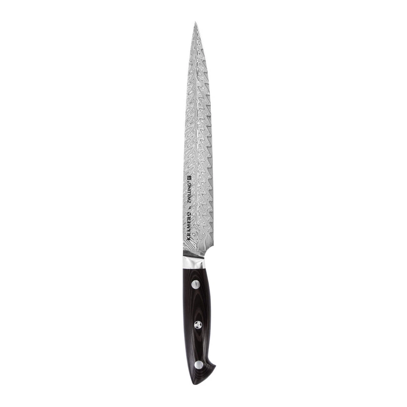Created with Master Bladesmith Bob Kramer, the KRAMER by ZWILLING EUROLINE Stainless Steel Damascus Collection features stainless steel blades made to his exacting standards, maximizing curves, balance and utility.Bob’s design has an extremely wide blade to maximize knuckle clearance for larger hands and for cutting through large produce and piles of food. Chopped food can easily be transported with this impressive, broad blade.The knives are hand-finished with a traditional 3-step process by skilled Japanese artisans. Combined with the SG2 micro-carbide powder steel, the ice-hardened CRYODUR blades deliver scalpel-like sharpness, stay sharper longer and can withstand more sharpening over their lifespan. The SG2 super steel core is protected by an exceptionally beautiful 100-layer Chevron Damascus pattern, which is complimented by a stunning black linen Micarta handle and signature Bob Kramer mosaic pin.